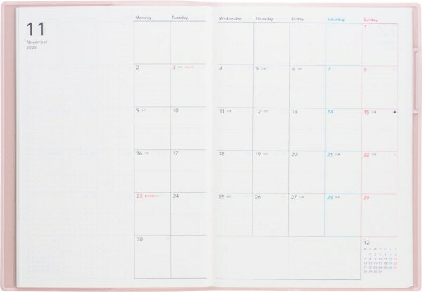 ・商品仕様・スペック・ISBN・978-4-471-79757-7・本体サイズ・B6判(182×128mm)・ページ数・192・レイアウト・4月始まり / 月曜始まり・装丁仕様・-・月間予定表・月間予定表ブロック・週間予定表・バーティカル式・月間予定表記入欄・2020年3月〜2021年6月・週間予定表記入欄・2020年3月〜2021年3月・こだわりの付録・年齢早見表・パーソナルデータ・ドット方眼メモ・地下鉄路線図/東京・大阪近郊鉄道路線図(別紙)・全4色のバリエーション・文字やイラストが自由に書ける、ドット方眼のメモスペース付き。